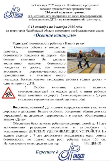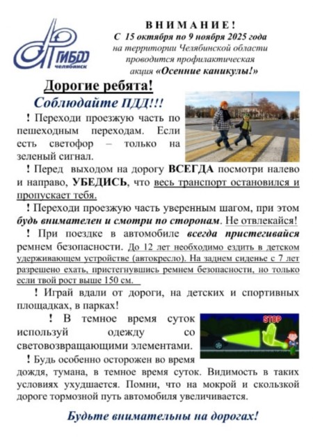 В целях предупреждения ДТП с участием детей в период осенних каникул на территории Челябинской области с 15 октября по 09 ноября 2025 года проводится профилактическая акция «Осенние каникулы», в ходе которой в нашей школе будут проводиться мероприятия: